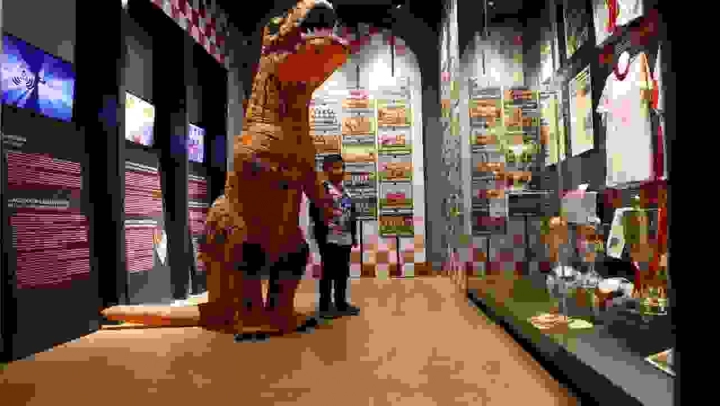 Elazığ Kent Müzesi'ne dinozor kostümüyle gelen 17 yaşındaki lise öğrencisi, ziyaretçilerin ilgi odağı oldu. Çocuklar hem fotoğraf çektirdi hem de Elazığ yöresine ait alanda, dinozorla birlikte halay çekti.
