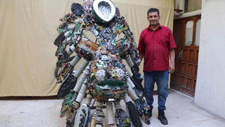 Hatay'ın Reyhanlı ilçesinde mozaik ve heykel sanatçısı Mervan Altınorak, elektronik atıklardan aslan figürlü devasa yüzük heykeli yaptı.