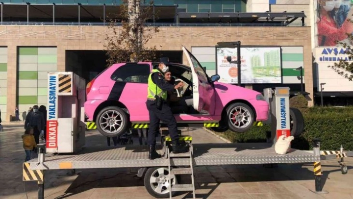 Malatya'da düzenlenen etkinlikte, emniyet kemerinin önemi simülasyon aracı ile uygulamalı olarak gösterildi.