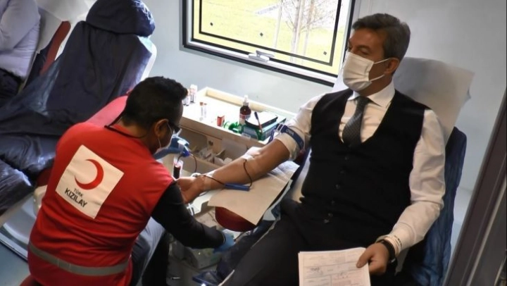 Emniyet Müdürü Levent Tuncer, Kızılay'ın kan depolarını doldurmanın bir vatandaşlık görevi olduğunu ifade ederek, 'Kızılay Haftası etkinlikleri kapsamında bizler de kurum olarak kan bağışında bulunmak için katılım sağladık. Kızılay'ın kurum içerisine getirdiği kan alma araçları ile personel olarak büyük bir duyarlılıkla kan bağışında bulunuyoruz. Bu beni ve ekibimi son derece mutlu ediyor. Ben de kampanyaya kan vermek suretiyle katkıda bulundum. Kan bağışlamanın ne kadar önemli olduğunu sizler de biliyorsunuz. Tıp olarak yapılamayan tek şeyin kan olduğunu biliyoruz. Bizler de kan vermek suretiyle destek veriyoruz. Özellikle içinde bulunduğumuz pandemi dolayısıyla kan alımlarında bir azalma oldu, bizler de bu azalmayı önlemek için kan bağışında bulunuyoruz. Kızılay'ın kan depolarını doldurmak hepimize görev olarak düşüyor. Ekibim olarak kan vermekten son derece mutlu olduğumu da belirtmek istiyorum' dedi.
