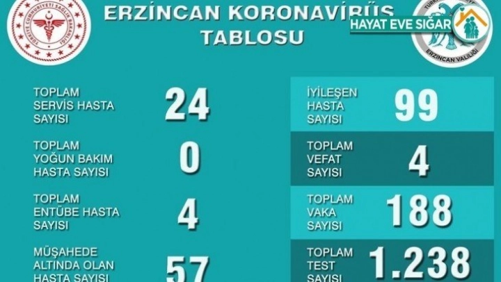 Erzincan Valisi Ali Arslantaş, twitter hesabından paylaştığı bilgilerde Erzincan'da toplam vaka sayısının 188, toplam vefat sayısı 4, iyileşen hasta sayısı 99, müşahede altında olan hasta sayısı 57, toplam entübe hastası 4, toplam servis hasta sayısı 24 toplam test sayısının ise 1238 olarak açıklanırken, yoğun bakım ünitesinde ise hastanın olmadığını paylaştı.