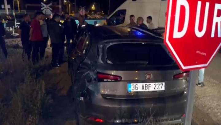 Erzurum'un Horasan ilçesinde yük treninin çarptığı otomobilde hasar meydana geldi.