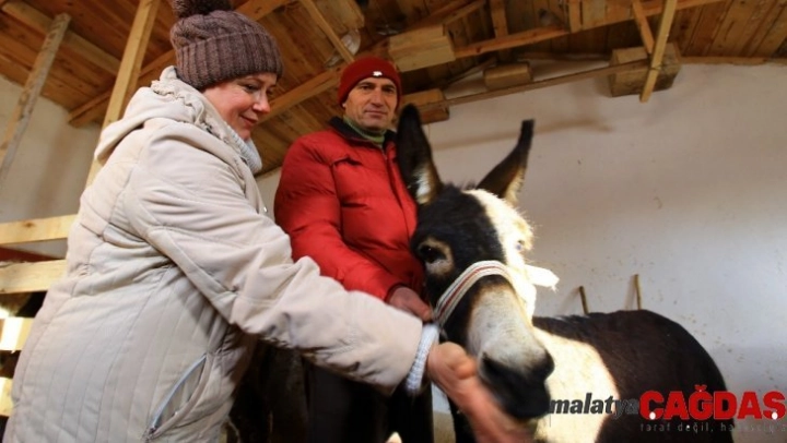 Antalya'dan Gümüşhane'nin Kelkit ilçesindeki köyüne dönen profesyonel futbolcu ve tenis antrenörü Nejat İbrahim Balcı, köyde yaylacılar tarafından kış mevsimi nedeniyle ölüme terk edilen eşekleri kurda kuşa yem olmasınlar diye Ukraynalı eşiyle birlikte bakıyor.