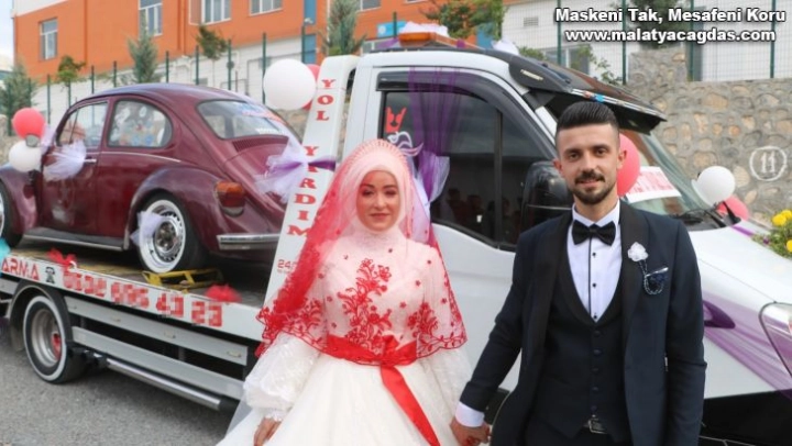 Malatya'da nişanlısının 'gelin arabası vosvos olsun' isteğini kırmak istemeyen oto kurtarma işi yapan damat Furkan Karakaplan, aracının üzerine yüklediği vosvosu ve çekiciyi gelin arabası yaptı.