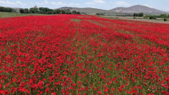 Elazığ'da yağışlar sonrası çiçek açan gelincikler tarlaları adeta kırmızı renge boyadı. Tarlalarda doğal olarak yetişen, narin ve hassas yapısıyla bilinen gelincikler, kırmızının her tonunu sergiledikleri görüntüleriyle doğaseverlere farklı bir güzellik sunuyor. Yeşil ile kırmızı renklerin oluşturduğu renk cümbüşü masalsı görüntüler oluştururken, havadan dron ile görüntülenen eşsiz manzara, doyumsuz görsel şölen sundu. Kentteki amatör fotoğrafçıların da ilgisini çeken gelincik tarlaları yer yer doğal fotoğraf stüdyosuna dönüşüyor.