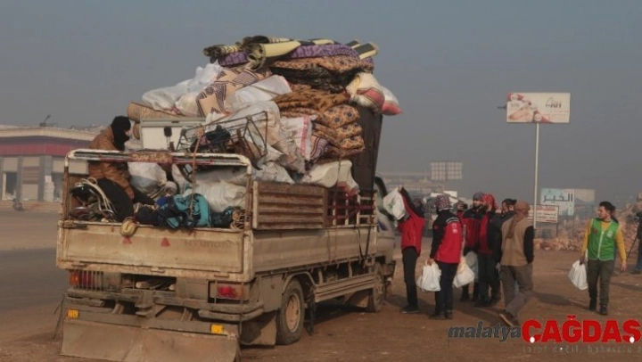 Suriye'nin İdlib ilinin güney kırsalından bombardıman nedeniyle Türkiye-Suriye sınırındaki bölgelere doğru göç eden sivillere acil yardım paketi dağıtıldı.
