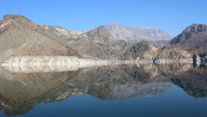 Erzurum'un Oltu ilçesindeki Ayvalı Barajı'nda berrak suya dağların yansıması kartpostallık görüntüler oluşturdu.