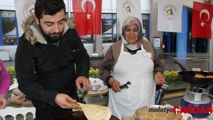 Sahip olduğu aroma nedeniyle Türkiye'nin vazgeçilmez kestaneleri arasında yer alan Düzce kestanesi, gözlemeye malzeme oldu. Fatma Doğan isimli ev hanımı, Düzce kestanesini kavurarak harmanladı. İç malzemelerini de ekleyen Fatma Doğan, kestaneli gözlemeyi yaparak, gözleme severlerin beğenisine sundu. Daha önce böyle bir lezzetin hiç yapılmadığını aktaran Fatma Doğan, ilk defa böyle bir tat ile vatandaşların beğenisine çıktıklarını dile getirdi. Fatma Doğan, 'Kestaneli gözleme. Kestane başka türlü nerede olacak. Kestanecilerden kestane alıp yemektense biz de böyle bir alternatif yaptık. Önce kestaneyi yıkıyoruz, ayıklıyoruz, fırınlıyoruz. Fırınladıktan sonra biraz böyle pişiyor ama tamamı ile pişmeyecek. Çünkü tamamı ile pişerse un haline gelir. Biraz fındık tarzında olsun diye biraz iri çekilir. Çekildikten sonra soğanladık, baharatladık, kavurduk. Soğanla kavurduğumuz zaman da kestaneyi attık, orada tekrar kavurmasını yaptık. 1-2 dakika bu işlemi yaptık. Kestane ile soğanın karışması için yaptık bu işi. Lezzeti birbirine kaynasın diye yaptık. Kestaneli gözleme daha önce hiçbir yerde yoktu. İlk defa yaptık. Şu anda buna ilgi var. Farklı lezzetler farklı kültürler Düzce'de. Düzce için biz her şeye varız. Bu gözleme tuzlu. Öyle şekerli değil. Ama tuzluda da aşırı tuzlu değil. Tuzlu yiyemeyenler için alternatif. Aşırı tuzlu olmamak şartı ile tatlı tuzlu bir şey oldu' dedi.
