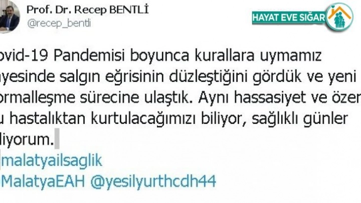 Bentli, salgın eğrisinin düzleştiğini gördükleri ve yeni normalleşme sürecine ulaştıklarına dikkat çekerek, “Covid-19 Pandemisi boyunca kurallara uymamız sayesinde salgın eğrisinin düzleştiğini gördük ve yeni normalleşme sürecine ulaştık. Aynı hassasiyet ve özenle bu hastalıktan kurtulacağımızı biliyor, sağlıklı günler diliyorum” ifadelerini kullandı.