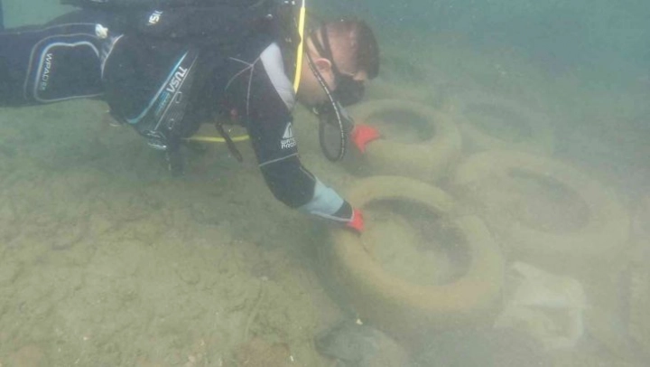 Ekipler, deniz kirliliğine neden olan araç lastikleri, plastik, cam gibi materyalleri torbalar içerisine koyarak yüzeye çıkarttılar.