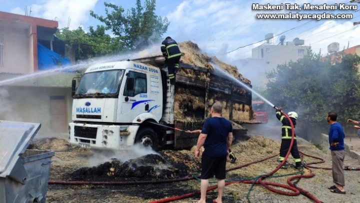 Hatay'ın Samandağ ilçesinde saman yüklü kamyon alev aldı. Yangın itfaiye ekiplerinin müdahalesiyle söndürüldü.