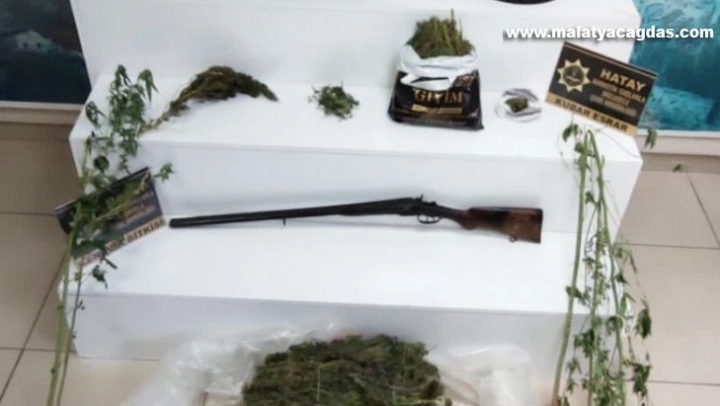 Hatay'ın Defne ilçesinde 1 kilo 674 gram kubar esrar, 21 adet hint kenevir bitkisi, 3 adet ruhsatsız av tüfeği ele geçirildi.