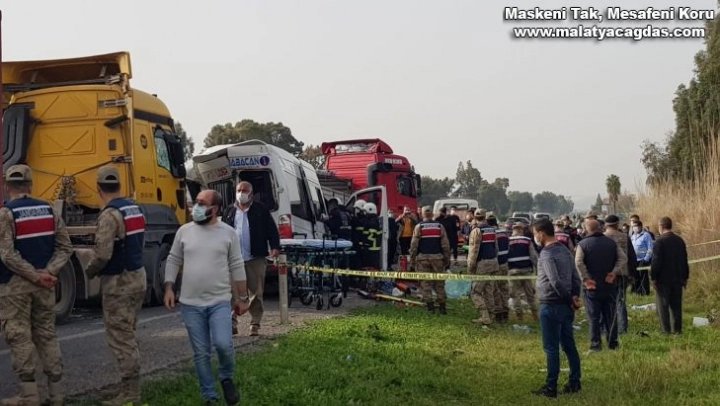 Edinilen bilgiye göre kaza, D-817 Karayolu Yeniyurt mahallesi Say mevkiinde meydana geldi. Dörtyol istikametinden Erzin yönüne giden plakaları ve sürücülerinin ismi öğrenilemeyen işçi servisi minibüs aynı istikamette gitmekte olan tıra arkadan çarparken, arkadan gelmekte olan bir başka tır da duramayarak kazaya karışan minibüse çarptı.