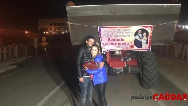 Tekirdağ'ın Malkara ilçesinde yaşayan bir genç, iş makinesine astığı yazılı afişle sürpriz evlenme teklifinde bulundu.