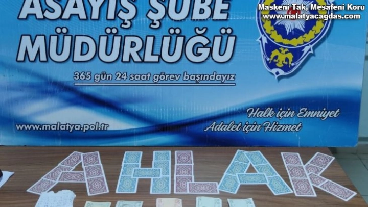 Malatya'da polis ekipleri Yeni tip korona virüs (Covid-19) tedbirleri kapsamında ruhsatsız bir kıraathaneye düzenlediği baskında 130 TL ve iskambil kağıtları ele geçirildi. Polisler, iskambil kağıtları ile "ahlak" yazarak, kumar oynayanlara mesaj verdi.