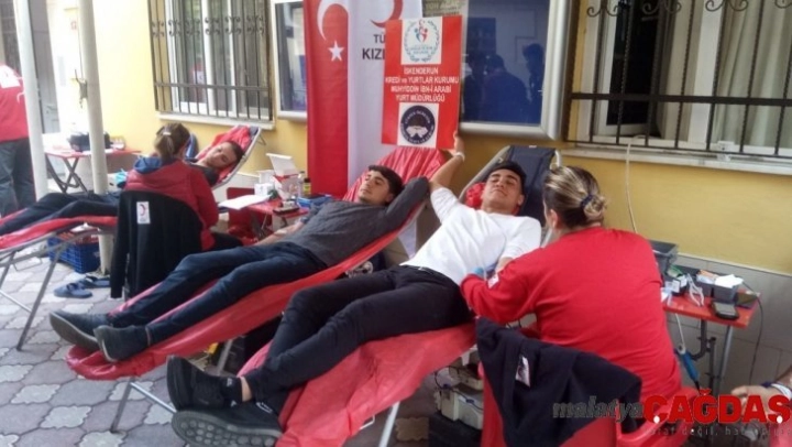 Hatay'ın İskenderun ilçesindeki Kredi ve Yurtlar Kurumu (KYK) Muhyiddin İbn-i Arabi Yurdunda kalan üniversite öğrencileri ve yurt personeli Kızılay'a kan bağışında bulundu.