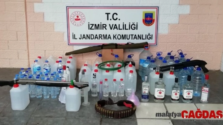 İzmir'in Menderes ilçesinde jandarma ekipleri, kaçak içki üretimi yapan adreslere yönelik baskında çok sayıda kaçak içki ele geçirdi.