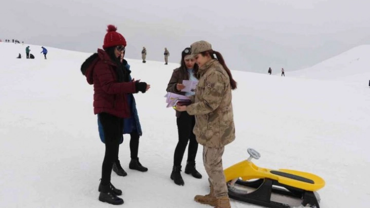 Bingöl'de Jandarma ekipleri, 2 bin 500 rakımlı Hesarek Kayak Merkezi'nde vatandaşlara KADES uygulamasını tanıttı.