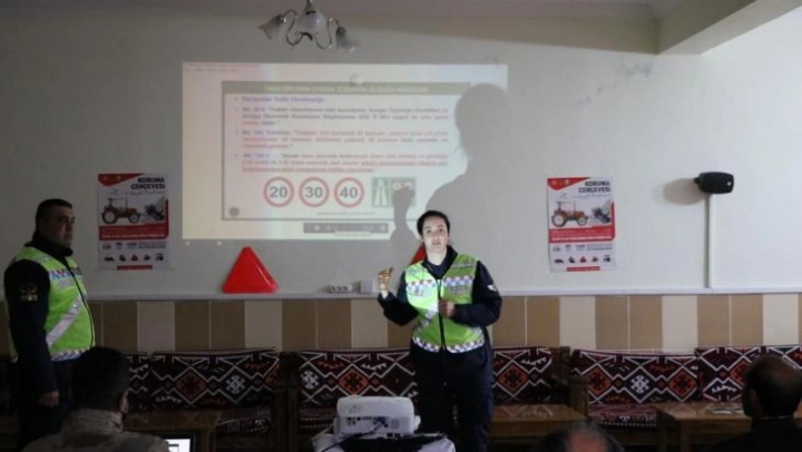 Elazığ'da jandarma trafik ekipleri, tarım araçlarının güvenli kullanımı konusunda traktör sürücülerine eğitim verdi.