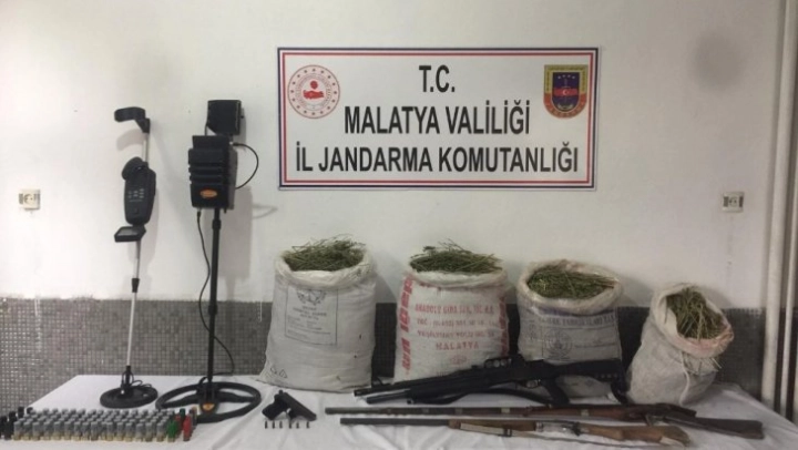 Yapılan aramada 55 kilo esrar, 7.65 mm çapında ruhsatsız tabanca, 1 adet tarihi değeri olduğu değerlendirilen tüfek, 1 adet ruhsatsız otomatik av tüfeği, 1 adet ruhsatsız tek kırma av tüfeği, 6 adet 7.65 mm çapında tabanca mermisi, 94 adet av tüfeği fişeği, 2 adet arama dedektörü ve malzemeleri ele geçirildi.