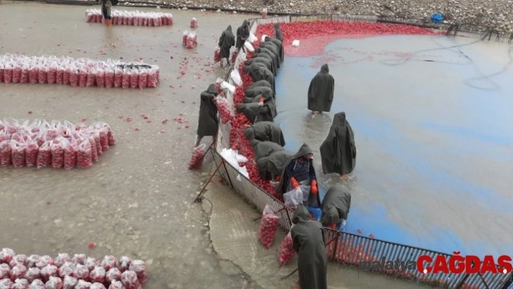 Savrun Çayı'nın yarım metreye varan soğuk suyunun içerisinde kadın işçiler günlük 70 TL yevmiye için sabahın ilk ışıklarıyla turp yıkama ve paketleme işine başlıyorlar.