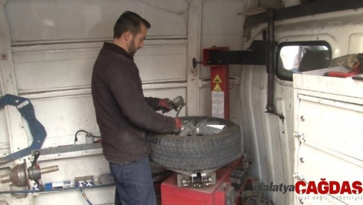 Konya'da oto lastik tamirciliği yapan Turan Yıldırım, 1,5 yıl önce kendi iş yerini kamyonetine açarak seyyar oto lastik tamirciliği yapmaya başladı. Genç lastikçi, kentteki merkez ilçelere lastik tamir aracı açarak müşterilerine daha ucuz hizmet vermeyi hedefliyor.