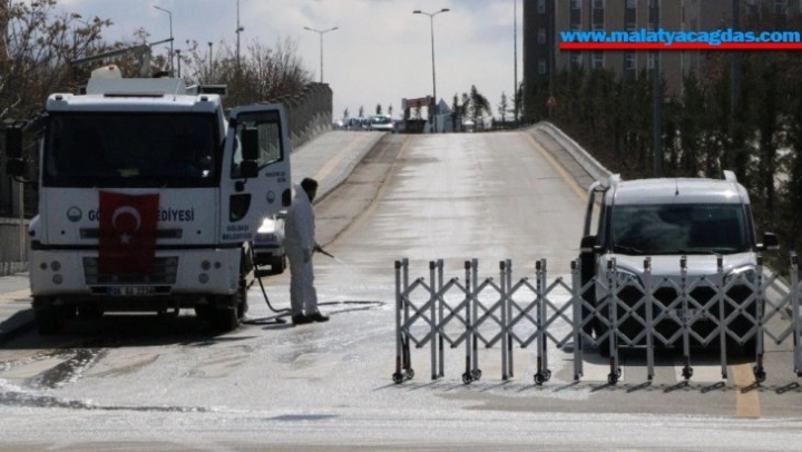 Umreden getirilen 3 bin 500 Türk vatandaşının Ankara'da bulunan KYK yurtlarındaki karantinaları devam ederken, karantinanın yapıldığı alan içerisine giren resmi ve sivil araçlar çıkışta belediye tankerleri tarafından ilaçlı suyla dezenfekte ediliyor.