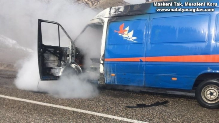 Adıyaman'ın Gölbaşı ilçesinde seyir halindeki kargo aracı cayır cayır yandı.
