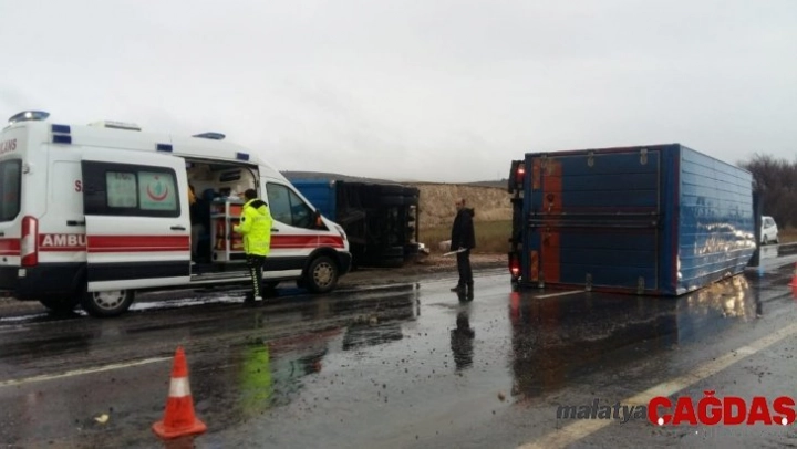 Çorum'da etkili olan yağmur nedeniyle kontrolden çıkan kamyonun devrilmesi sonucu meydana gelen trafik kazasında 2 kişi yaralandı.
