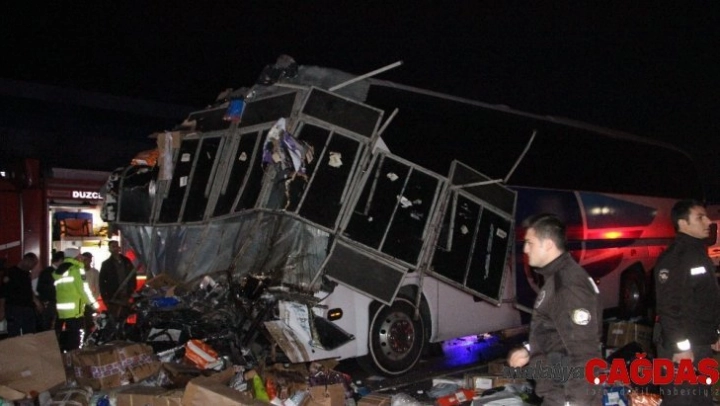 Düzce(İHA) – Tem Otoyolu Düzce istikametinde meydana gelen trafik kazasında otobüs ile Kargo Kamyonu çarpıştı. Kazada otobüs şoförü ve muavin hayatını kaybederken 26 kişi yaralandı. Otoyol Ankara şeridi uzun süre trafiğe kapatıldı.