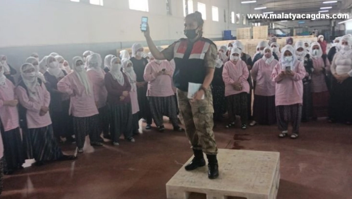 Malatya'da jandarma ekipleri, kayısı paketleme işçisi kadınlara KADES anlatılarak, kadınların cep telefonlarına KADES uygulaması yüklendi.