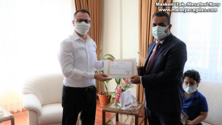 Diyarbakır'ın Kayapınar İlçe Kaymakamı ve Belediye Başkan Vekili Ünal Koç, özverili ve başarılı çalışmalarıyla eğitime desteklerinden dolayı Vehbi Koç İlkokulu Müdürü Osman Aydın'ı evinde ziyaret ederek, başarı belgesi ile ödüllendirdi.