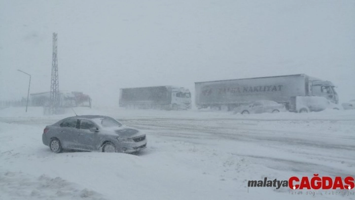Kayseri'nin Pınarbaşı ilçesinde etkisini artıran tipi nedeniyle otomobil ve tırlar yolda mahsur kaldı.
