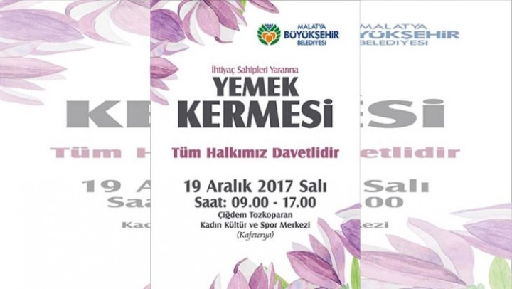 Malatya Büyükşehir Belediyesi Çiğdem Tozkoparan Kadın Kültür ve Spor Merkezi tarafından ihtiyaç sahipleri yararına kermes düzenlenecek.