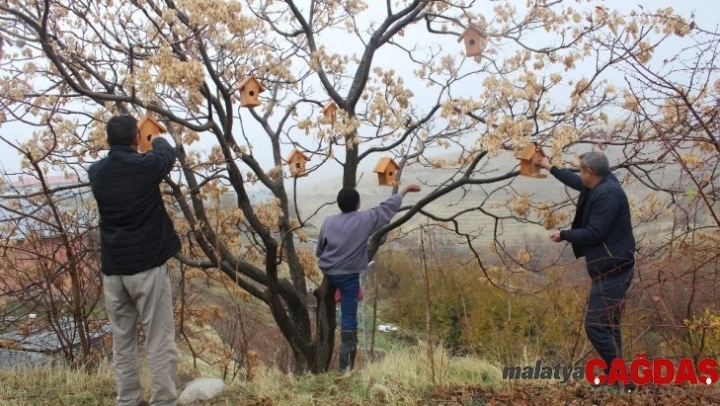 Elazığ'da 50 haneli olan ancak kışın 12 haneye kadar düşen bir köyde, muhtar ve yöre sakinleri tarafından 350 adet kuş evi yaptırılarak, ağaçlara asıldı.