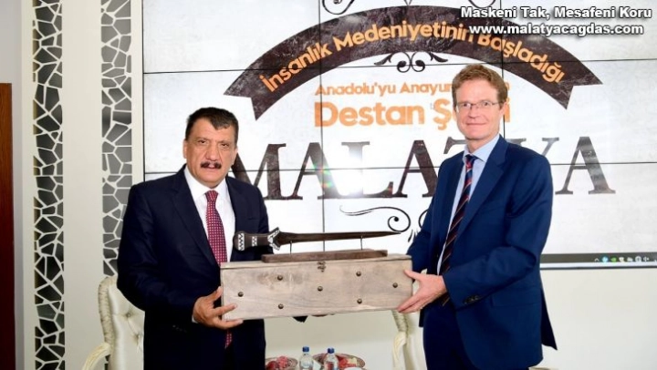Landrut'a Malatya ile ilgili bilgiler de veren Başkan Gürkan, “Biz Malatya'yı tarif ederken insanlık medeniyetinin başladığı Anadolu'yu Anayurt yapan destan şehri Malatya olarak tarif ediyoruz. İnsanlık tarihinde ilk yerleşik hayatın, bürokrasi hayatının, gümrükleme işlemlerinin, ilk muhasebe işlemlerinin, ilk ambarlama işlemlerinin ve saray devleti olgusunun tekâmül ettiği yer Malatya'dır. Ayrıca Taş Devrinden Demir Devrine evrilmede demirin kılıç ve mızrak olarak ilk kullanıldığı yerde Malatya'dır. Tabiri caizse insanlık medeniyeti bulunduğumuz topraklarda başlamıştır. Bu fikir Aslantepe Höyüğü'nde ilk kazıyı yapan Fransızlar, daha sonra bu kazıyı 1961 yılından sonra günümüze kadar sürdüren İtalyanların yaptıklarında görüyoruz. Aynı zamanda Aslantepe Höyüğü'de UNESCO Kültürel Miraslar Aday Listesi'nde olup bu süreç içerisinde Temmuz ayında asıl listeye geçmesini düşünüyoruz. Bu anlamda Malatya'yı değerlendirirken insanlık medeniyetinin başladığı yer olarak değerlendirip pozitif ayrımcılık anlamında farklı düşünülmesi gerektiğine de inanıyoruz. Dış Politikada bu çerçevede Malatya'nın değerlendirilmesinin daha doğru olacağını düşünüyorum. Malatya'nın bir diğer özelliği de Dünya'nın Kayısı Başkenti olarak değerlendirilmesidir. Sayın Büyükelçi Nicolaus'a şehrimize ve bizlere yaptıkları ziyaretten dolayı teşekkür ediyorum” ifadelerini kullandı.