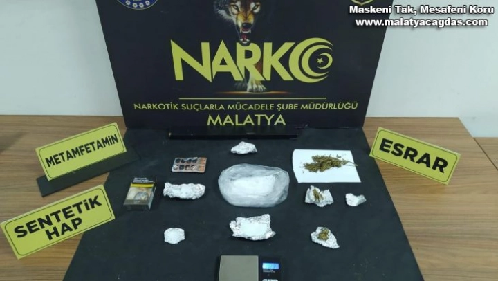 Malatya Emniyet Müdürlüğü Narkotik Suçlarla Mücadele Şube Müdürlüğü ekiplerince torbacı olarak tabir edilen sokak satıcılarına yönelik düzenlenen operasyonda 38,5 gram metamfetamin, 12 gram esrar, 4 adet yeşil reçeteye tabi hap ele geçirildi.