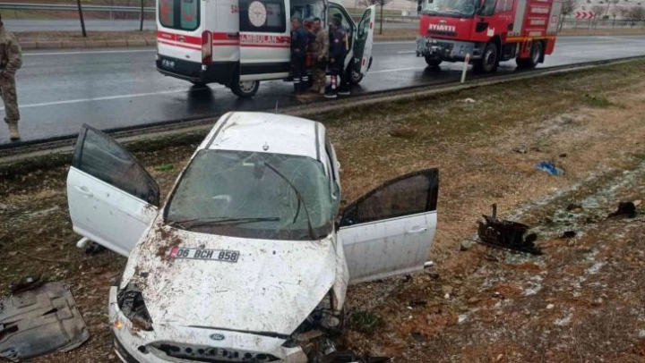 Mardin'in Mazıdağı ilçesinde etkili olan dolu yağışı kazaya neden oldu. Kontrolden çıkan otomobil şarampole yuvarlandı. Kazada 2 kişi yaralandı.