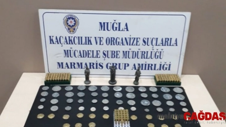 Muğla'nın Marmaris ilçesinde polisin düzenlediği operasyonda Roma dönemine ait 65 adet sikke ele geçirildi.