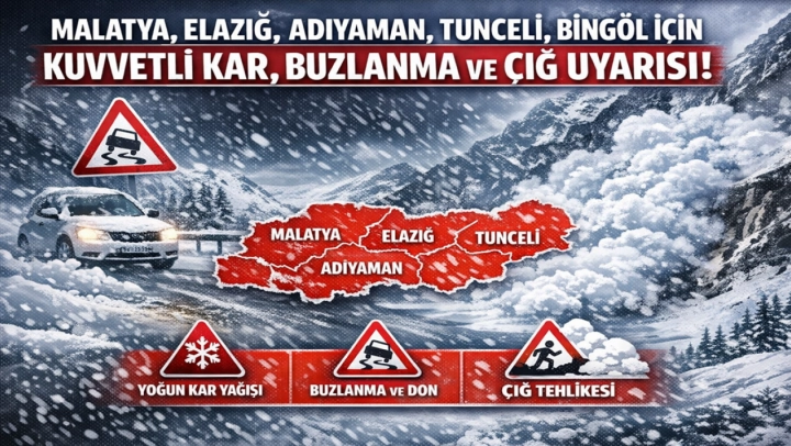 Meteoroloji, Elazığ, Malatya, Tunceli, Bingöl ve Adıyaman çevreleri için kuvvetli kar yağışı, buzlanma, don ve çığ tehlikesine karşı uyardı. Yüksek kesimlerde kar yağışının zaman zaman etkisini artırması bekleniyor.