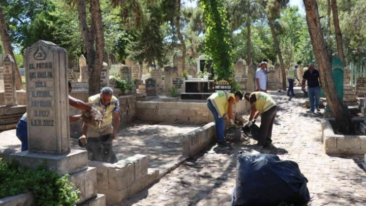 Şanlıurfa Büyükşehir Belediyesi, kurban bayramı öncesi mezarlıklarda temizlik çalışması başlattı.