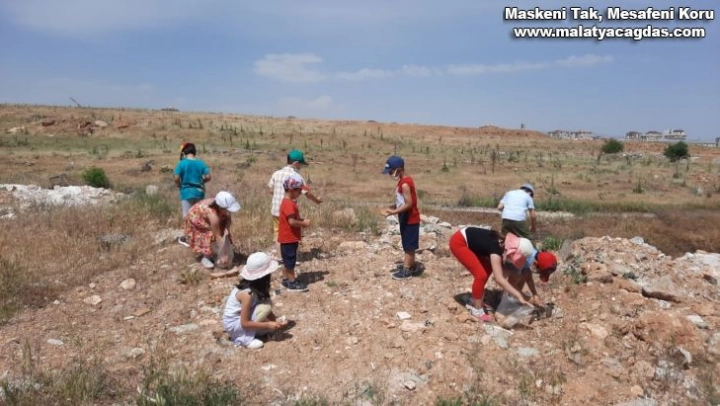 Malatya'da minik öğrenciler, sokakta çöp toplayarak sokak hayvanları için doğaya yiyecek bıraktı.