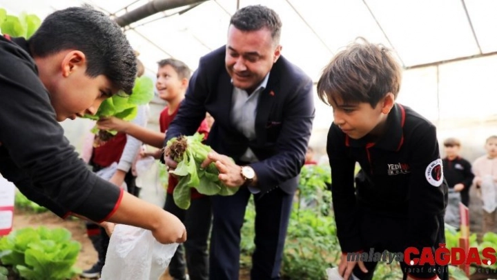 Antalya'nın Alanya ilçesinde öğrencilere toprak sevgisini aşılamak amacıyla gerçekleştiren proje kapsamında kurulan serada organik ürün yetiştirilerek uygulamalı eğitim veriliyor. Domates, salatalık ve biber gibi ürünler yetiştiren minikler ilk ürünlerini ise Ziraat Mühendisi olan Alanya Belediye Başkanı Adem Murat Yücel ile topladı.