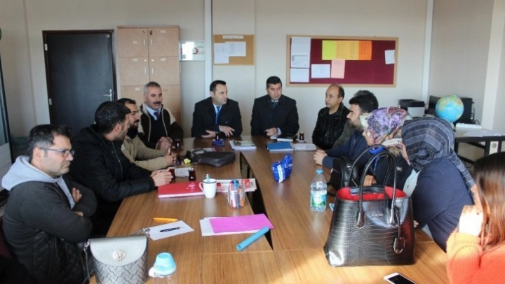 İlçe Milli Eğitim Müdürü İbrahim Halil Tunçmen ve ilçe Milli Eğitim Şube Müdürü Abdurrahman Yılmaz, okul idaresi ve öğretmenler ile bir araya geldiği istişare toplantısında öğretmenlerle sohbet ederek çalışmalarını sürdürüyor.