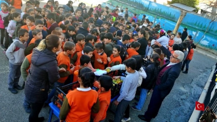 İnönü İlkokulu öğretmenleri Şule Yaşar ve Özlem Bilgiç öncülüğünde başlatılan 'meyve günü' etkinliğinde bahçeye kasa kasa meyveler konularak öğrencilere meyve dağıtıldı.