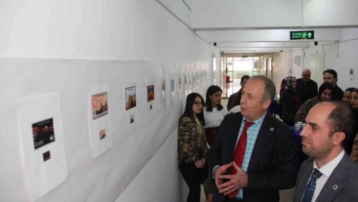 Erzurum'un Oltu ilçesinde Meslek Yüksek Okulu Grafik Tasarım Bölümü öğrencilerinin tasarladığı yaklaşık 80 pulun yer aldığı sergi açıldı.