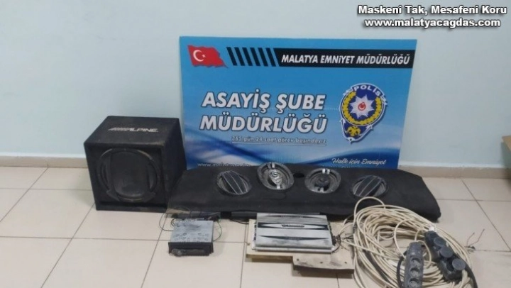 Edinilen bilgiye göre, bir araçtan, 4 hoparlör, 1 oto teybi, 1 amfi,1 kolon aksesuarı ve 70 metre uzunluğunda elektrik kablosu çalındı. Polis hırsızlık olayı ile ilgili şüpheli iki şahsı tespit edip çalmış oldukları malzemeler ile birlikte yakaladı.