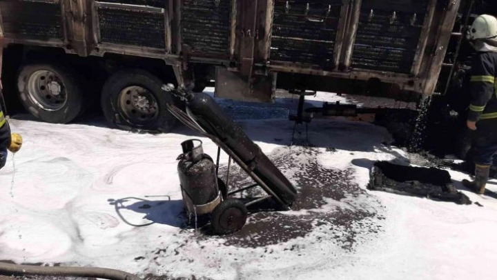 Gaziantep'te oto sanayi sitesinde kaynak yapıldığı esnada patlayan oksijen tüpü korku dolu anlara neden oldu. Patlamanın etkisiyle kısa sürede büyüyen alevler iki işçiyi ağır yaralarken, kaynak yapılan kamyonu küle çevirdi.