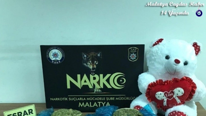 Edinilen bilgiye göre, Malatya Emniyet Müdürlüğü Narkotik Suçlarla Mücadele Şube Müdürlüğü ve İstihbarat Şube Müdürlüğü tarafından koordineli olarak yapılan çalışma sonucunda, Malatya-Elazığ karayolu yol uygulama noktasında batı illerine giden bir yolcu otobüsünde arama yapıldı. Aramalarda bir yolcuya ait oyuncak ayı içerisinde 6 kilo 224 gram kubar esrar maddesi ele geçirildi.
