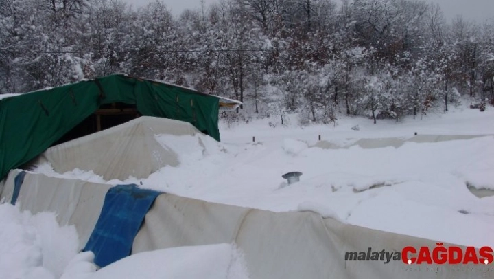 Bilecik'in Pazaryeri ilçesinde üç gündür aralıksız devam eden kar yağışı sonucu içinde küçükbaş hayvan beslenen çadırdan yapılmış bir ahırın çatısı çökerken, şans eseri hayvanlar zarar görmedi.